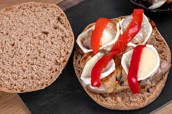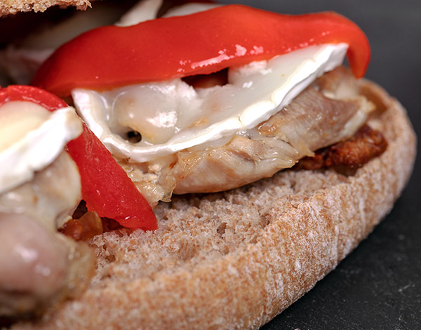 Mollete integral con churrasco de pollo, pimiento rojo asado y queso de cabra