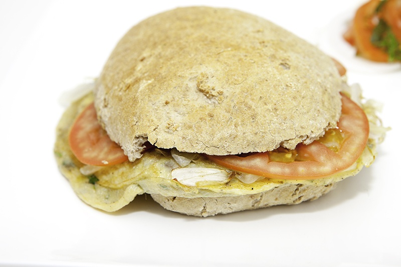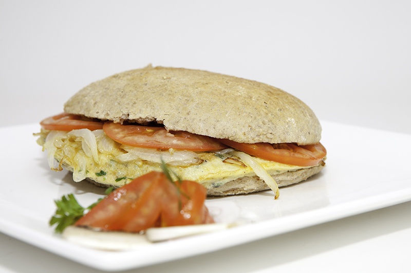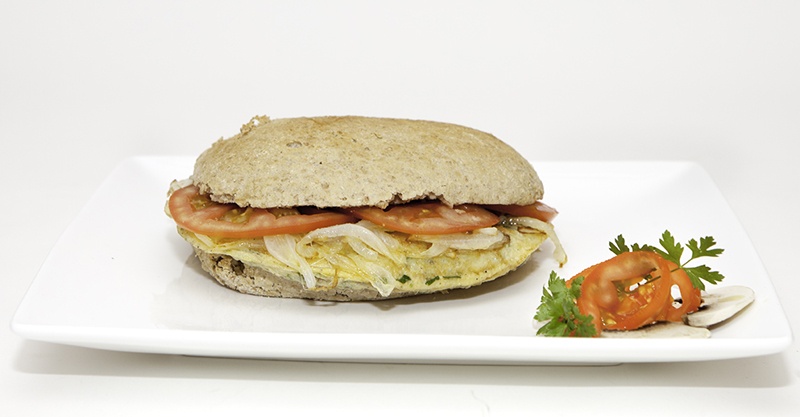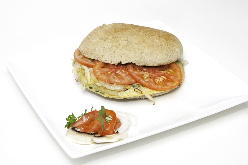 Mollete integral, con tortilla de champiñones y perejil, cebolla pochada y tomate natural